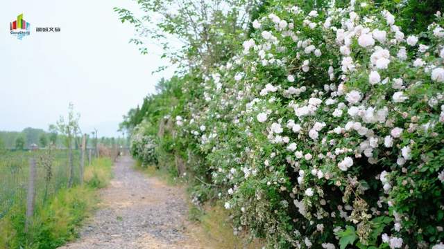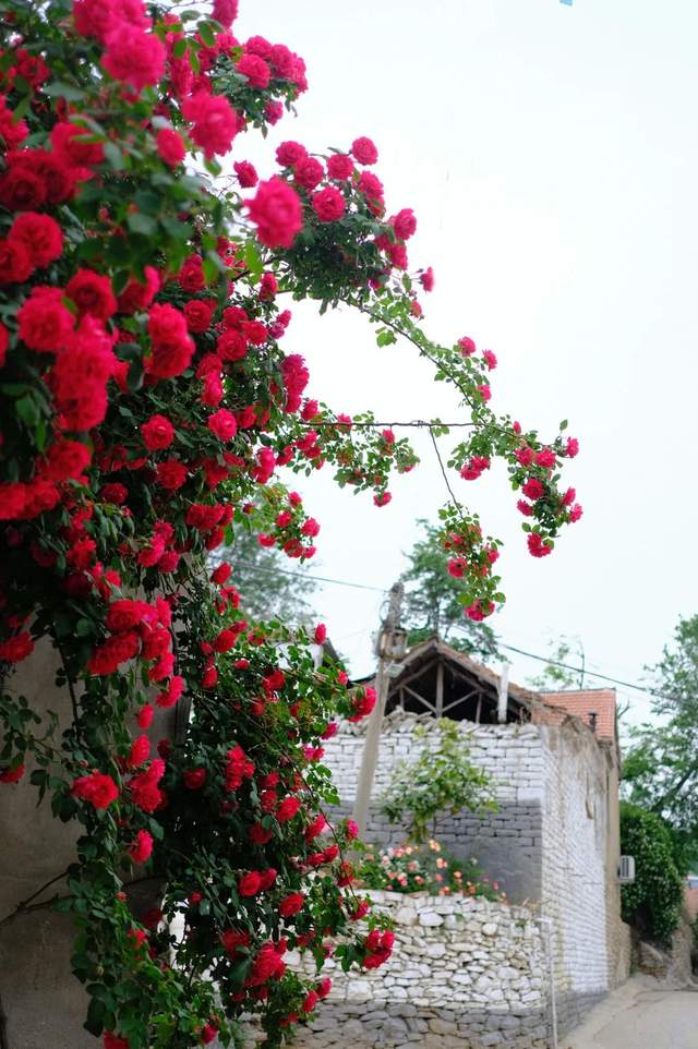 循着蔷薇的踪迹行至一座村庄的路边,一丛丛、一簇簇蔷薇交织错落,蔷薇藤蔓柔软且自由的垂在田间地头,在蓝天白云的背景下,层层叠叠,绵延不断,枝枝繁花重重,画面温柔到极致,走在路边,花香阵阵袭来,满城尽是芬芳,像是误入了醉人的世外桃源。