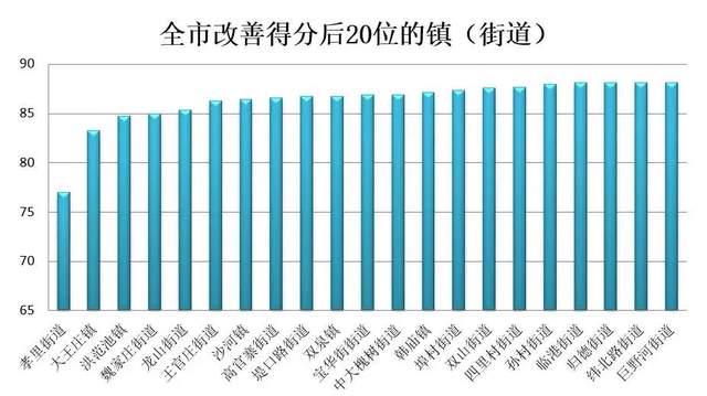 进入全市改善排名后20名的镇(街道)中,章丘区4个,市中区、天桥区、长清区、高新区各3个,商河县2个,槐荫区、莱芜区、平阴县各1个。改善排名倒数第1至20位分别为孝里街道、大王庄镇、洪范池镇、魏家庄街道、龙山街道、王官庄街道、沙河镇、高官寨街道、堤口路街道、双泉镇、宝华街街道、中大槐树街道、韩庙镇、埠村街道、双山街道、四里村街道、孙村街道、临港街道、归德街道、纬北路街道、巨野河街道。