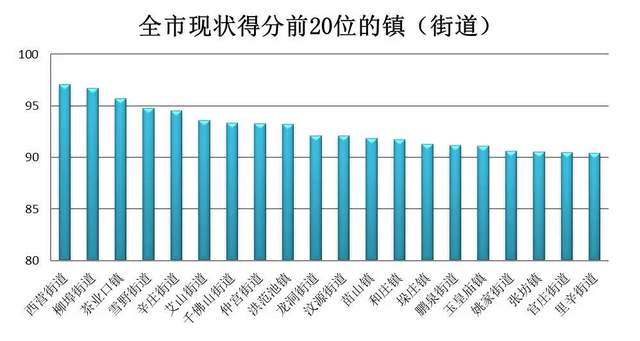 进入全市现状排名前20名的镇(街道)中,莱芜区5个,钢城区4个,历下区、南部山区各3个,章丘区、商河县各2个,平阴县1个。现状排名正数第1至20位分别为西营街道、柳埠街道、茶业口镇、雪野街道、辛庄街道、艾山街道、千佛山街道、仲宫街道、洪范池镇、龙洞街道、汶源街道、苗山镇、和庄镇、垛庄镇、鹏泉街道、玉皇庙镇、姚家街道、张坊镇、官庄街道、里辛街道。