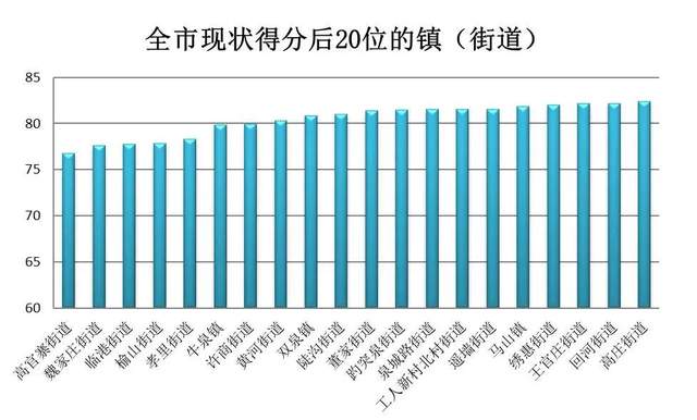 进入全市现状排名后20名的镇(街道)中,市中区、长清区、章丘区各3个,历下区、莱芜区、高新区各2个,天桥区、历城区、济阳区、平阴县、商河县各1个。现状排名倒数第1至20位分别为高官寨街道、魏家庄街道、临港街道、榆山街道、孝里街道、牛泉镇、许商街道、黄河街道、双泉镇、陡沟街道、董家街道、趵突泉街道、泉城路街道、工人新村北村街道、遥墙街道、马山镇、绣惠街道、王官庄街道、回河街道、高庄街道。