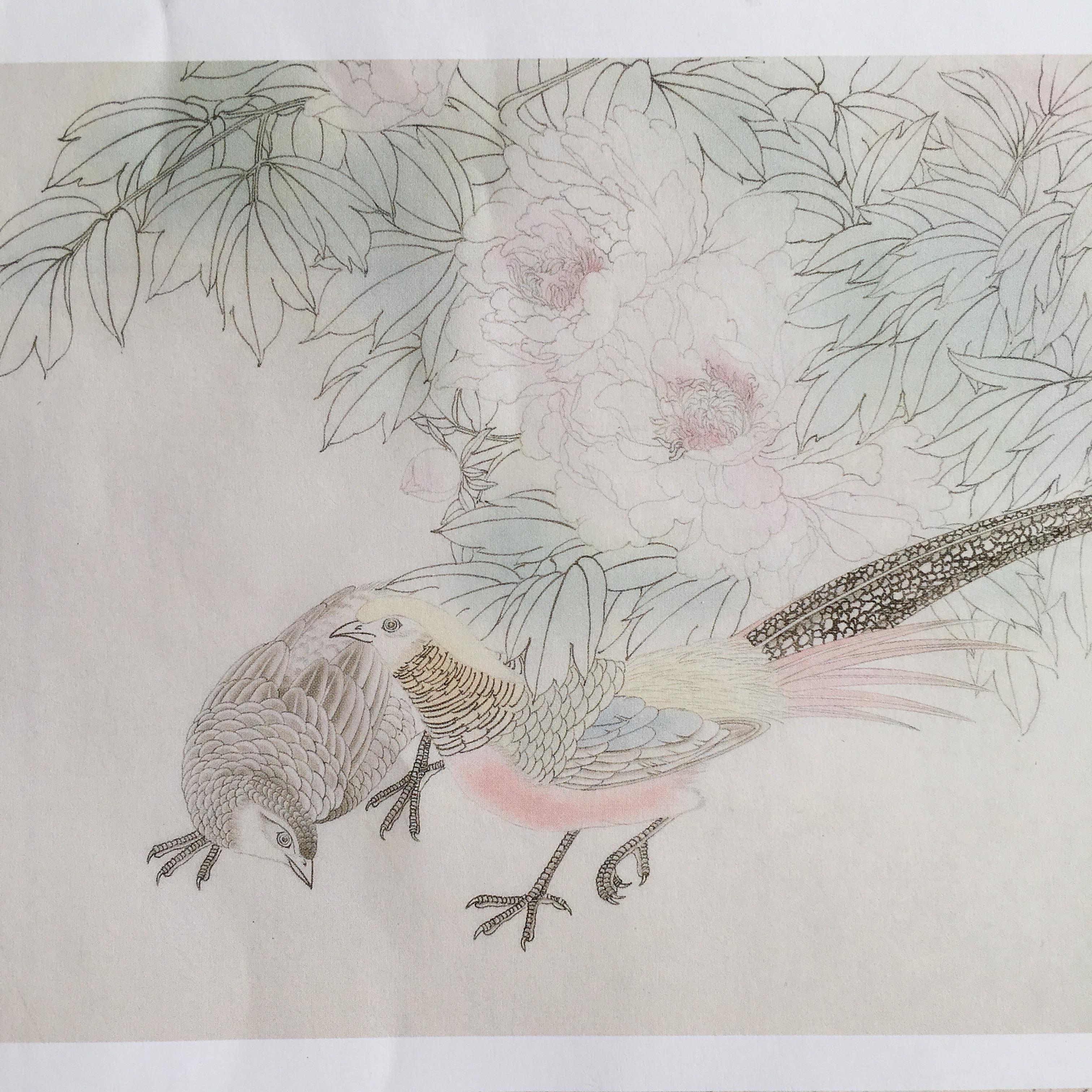 步骤六:整理是最后的完成部分,要注意整个画面的协调性。花头用钛白提高光,点花蕊的时候需要细心,先用朱硬平涂,然后用藤黄分染,最后用钛白提高光,体现出立体感。叶子用淡花青墨勾勒出叶脉。深入刻画锦鸡,丝毛,点睛,提画细节,锦鸡腹部用大红加墨丝毛,头部羽冠用钛白提高光,尾羽罩染赭石,喙和爪子罩染藤黄。雌鸟暗处和头部用焦茶统染,腹部用钛白晕染。淡墨画地面,统染花青墨和焦茶。题字、铃印,完成。