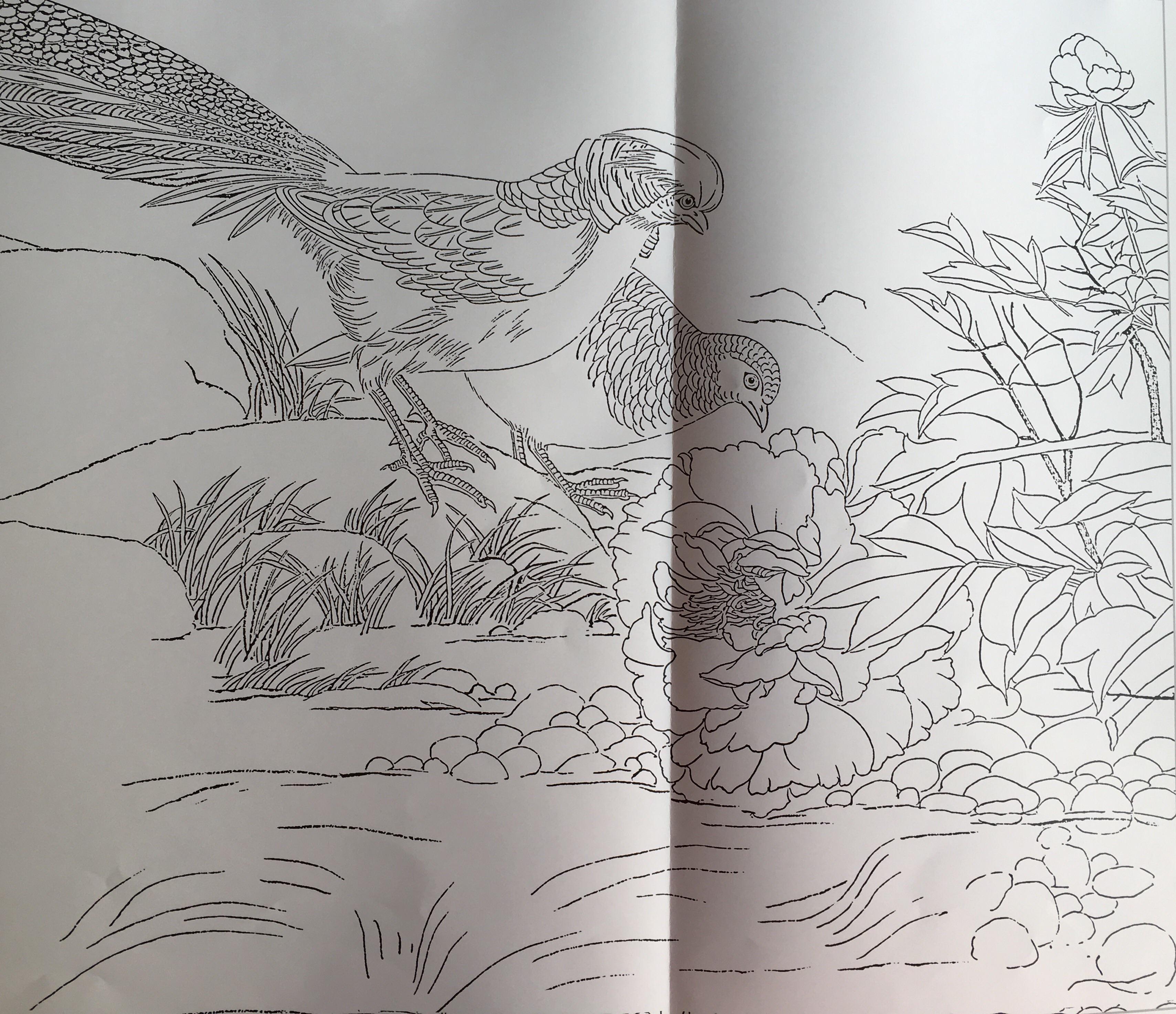 步骤一:勾线。用重墨勾尾部的羽毛和羽冠,中墨勾喙、眼、爪子,淡墨勾颈、胸、翅,稍淡墨勾勒花头、叶子和石头。