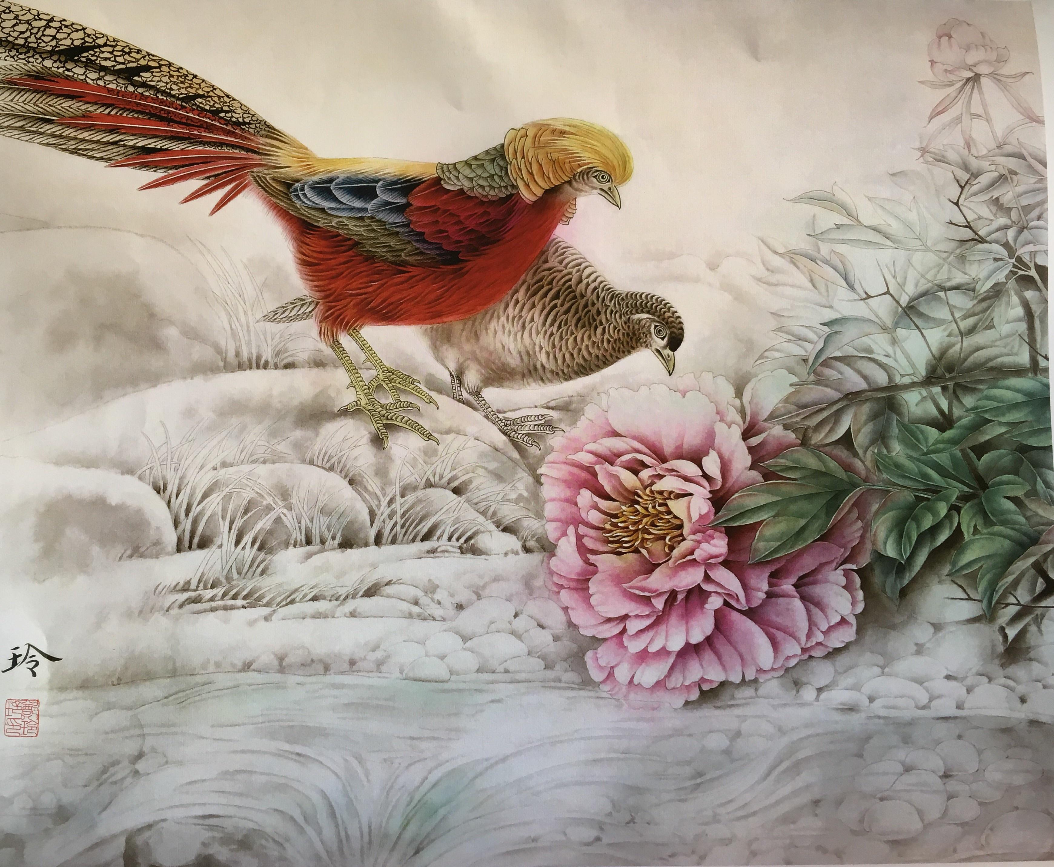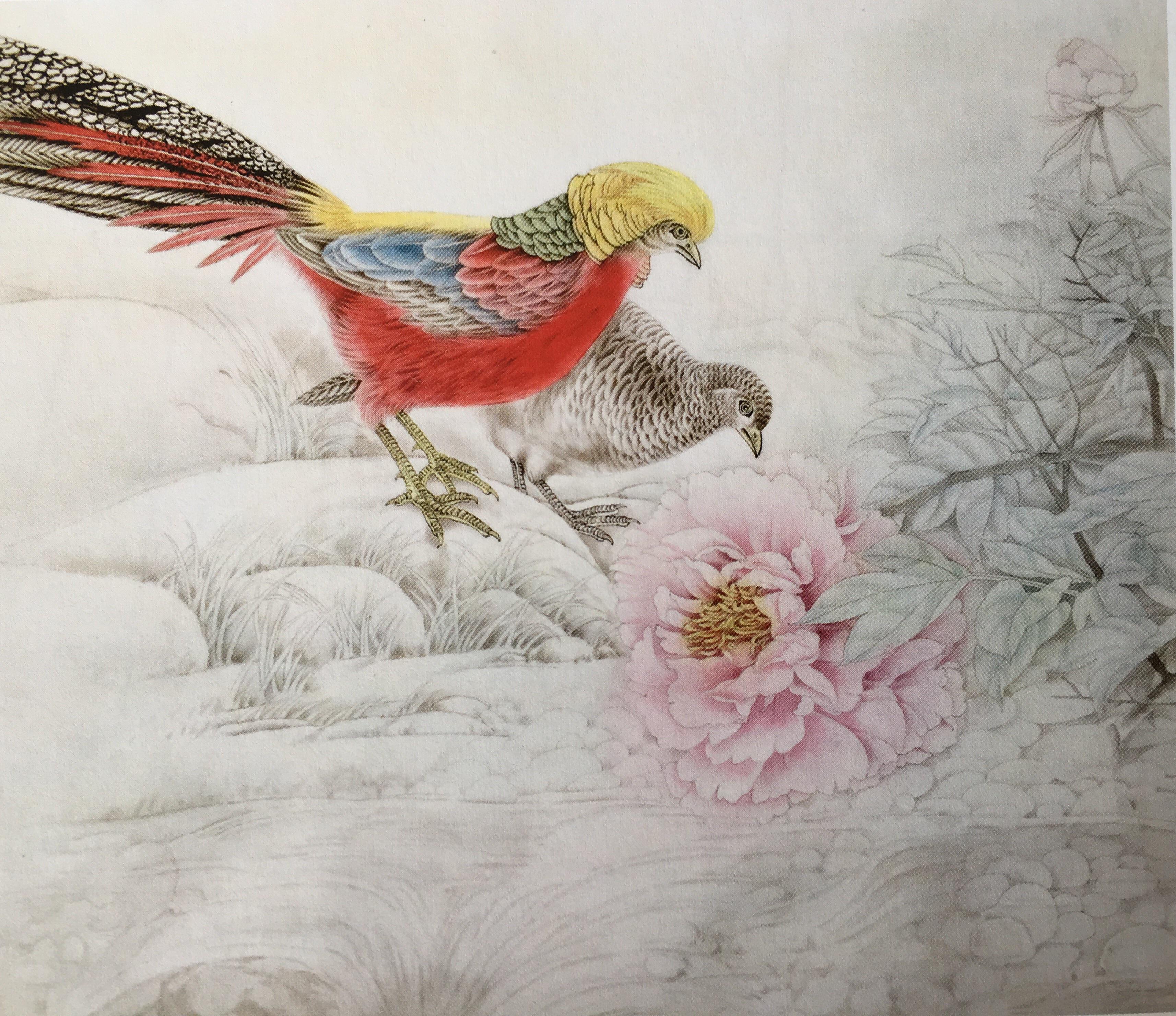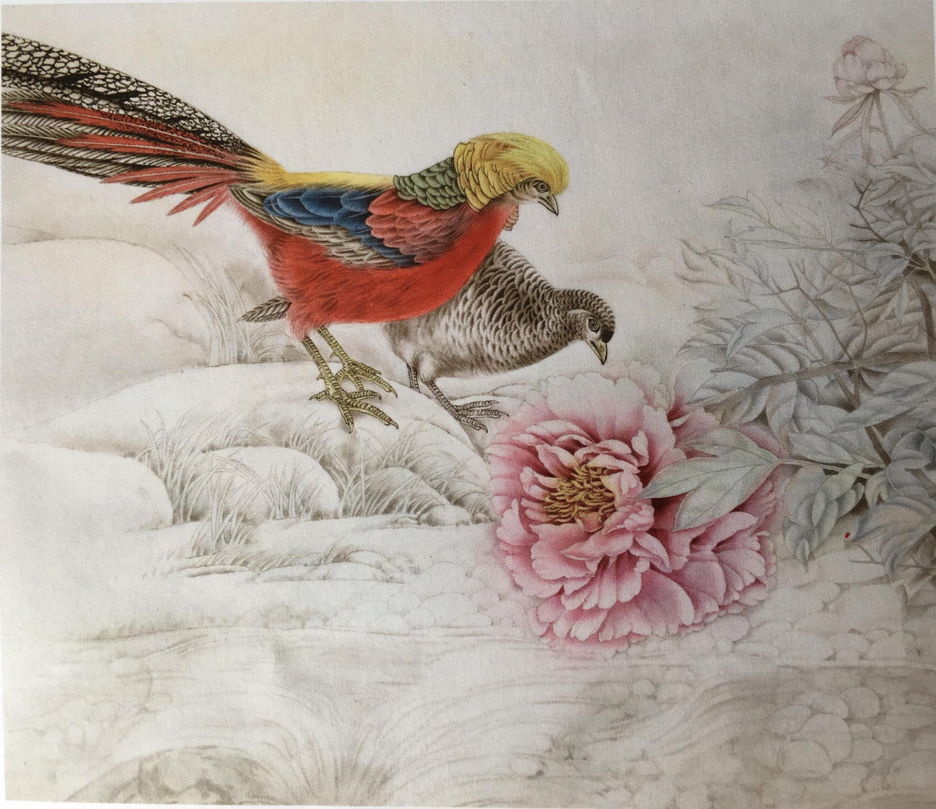 步骤六:整理是最后的完成部分,要注意整个画面的协调性。花头用钛白提亮高光,花蕊用淡粉黄提高光,花头前的叶子罩染草绿,再用胭脂边缘提染。深入刻画锦鸡,丝毛,点睛,提画细节,红腹锦鸡腹部用大红加墨丝毛,头部羽冠用钛白提高光,尾羽罩染赭石加朱磦,喙和爪子罩染藤黄,上背、下背和颈部处最后分别罩染嫩绿、粉黄和紫色,使颜色绚丽多彩。雌鸟暗处和头部用焦茶统染。整体画面上部用朱磦加藤黄大片统染,水面用四绿罩染。题字、铃印完成。