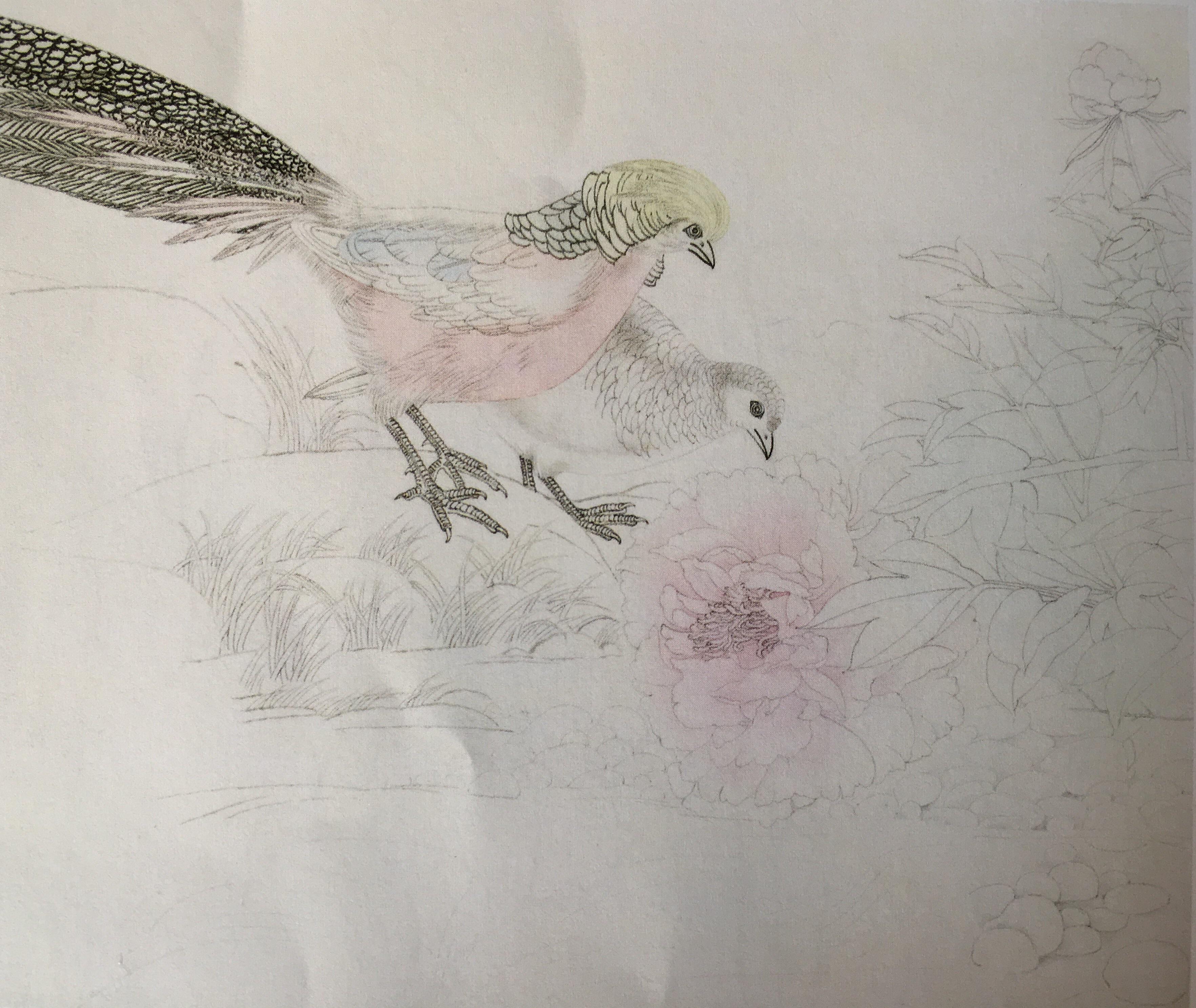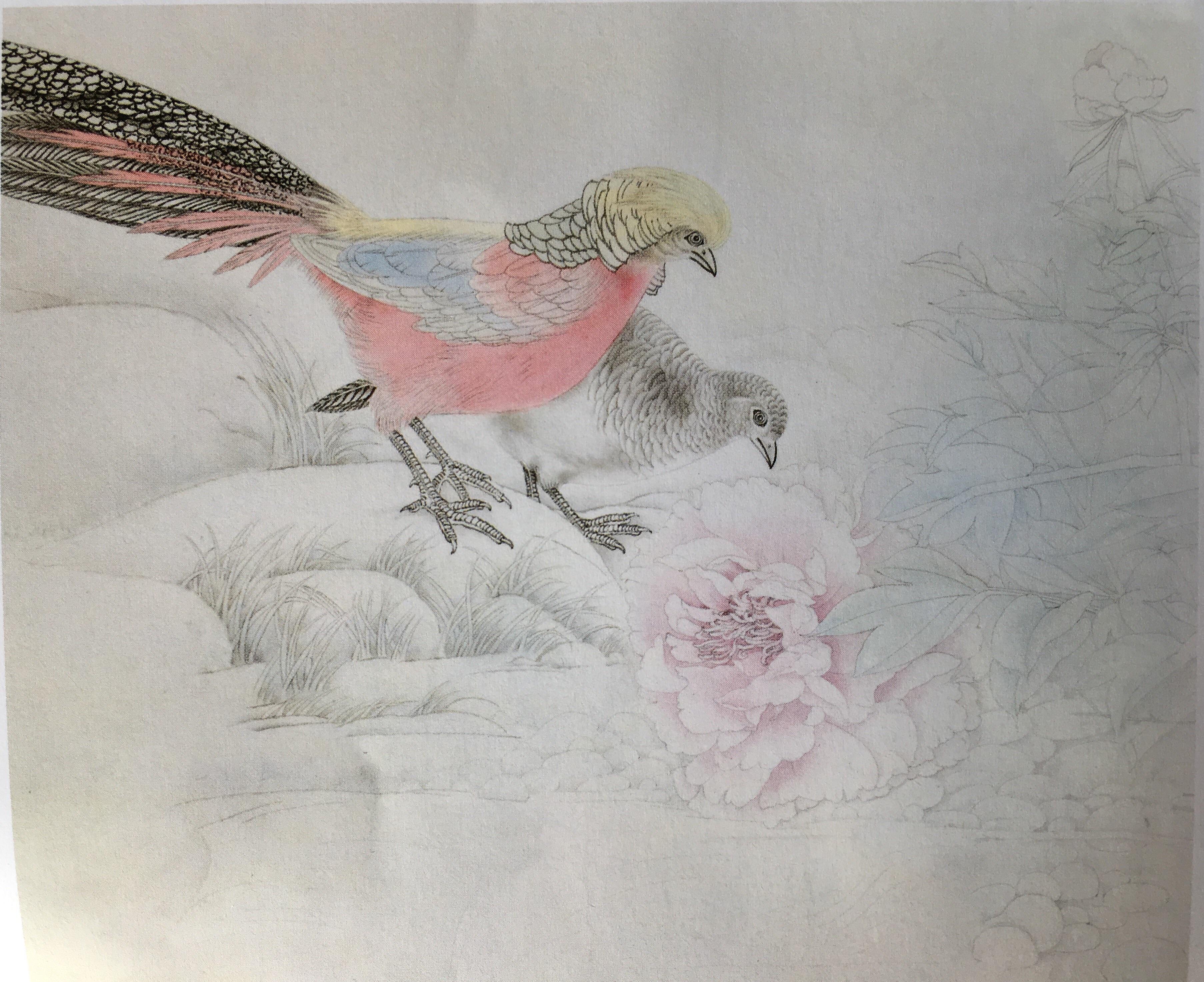 先用钛白淡淡平涂,再用牡丹红晕染,叶子用淡草绿大面积统染,不必太细。红腹锦鸡腹部用大红晕染,头部羽冠用藤黄。雌鸟用淡墨分出大概明暗关系,中墨分染眼部。