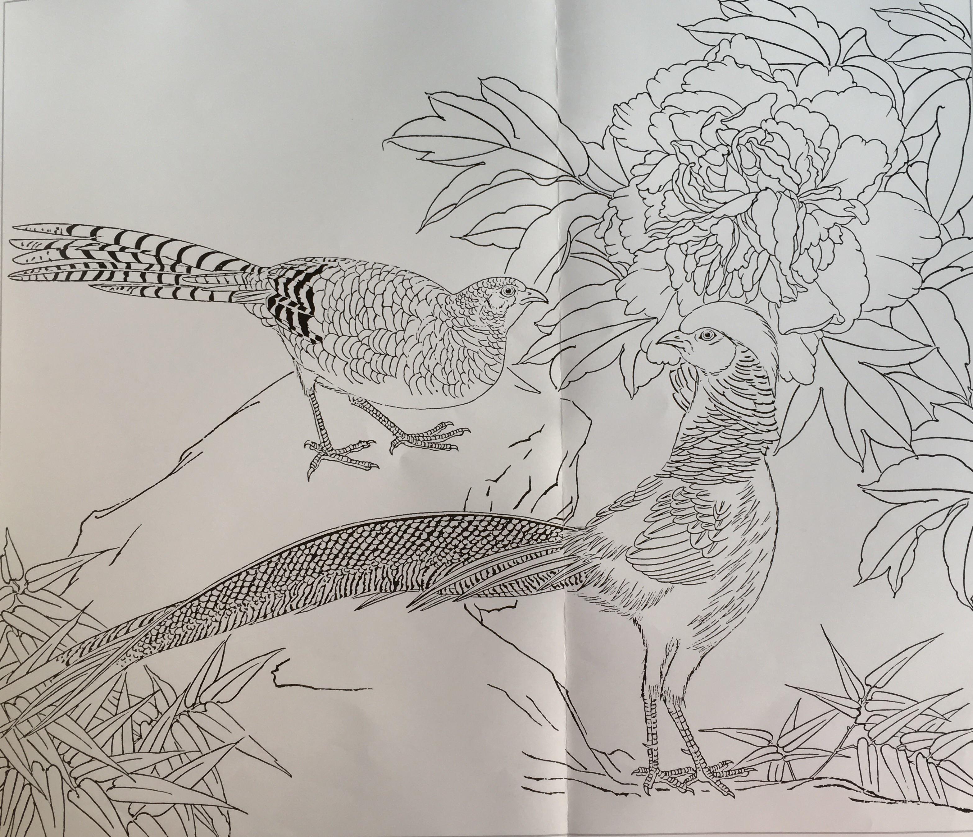 步骤一:勾线。用重墨勾尾部的羽毛和羽冠,中墨勾喙、眼、爪子,淡墨勾颈、胸、腹、翅、叶子,稍淡墨勾勒花头、竹子和石头。