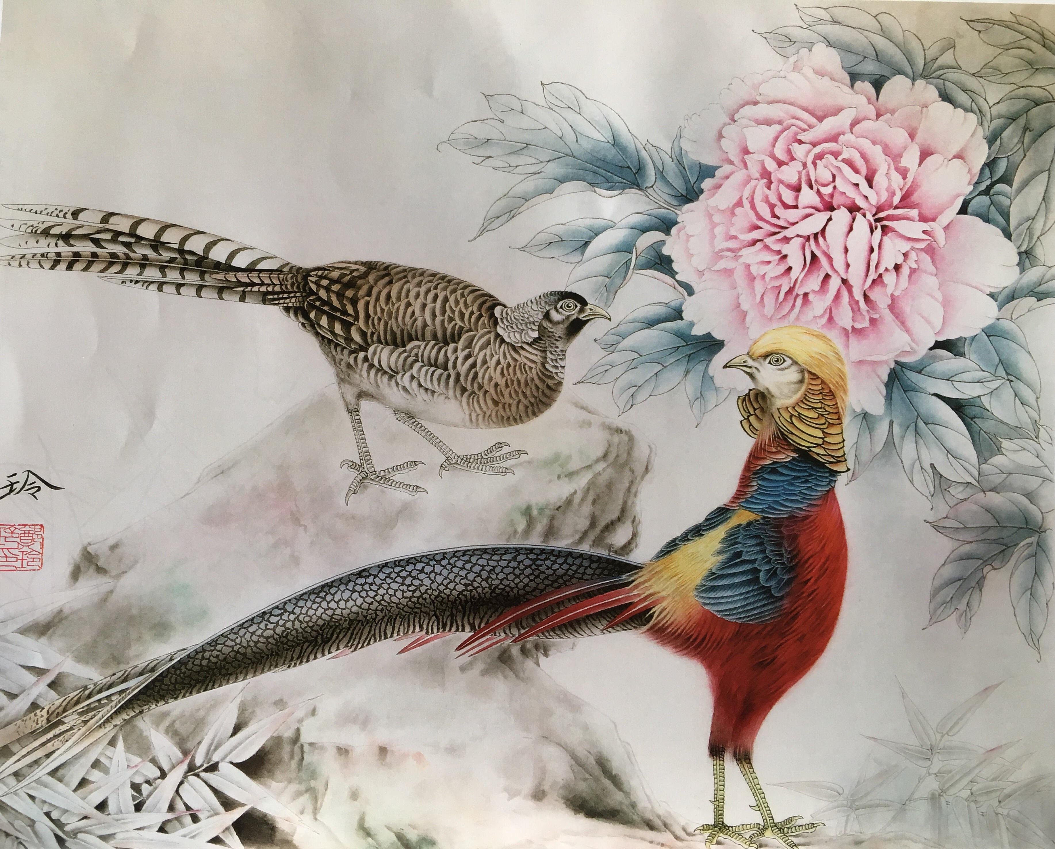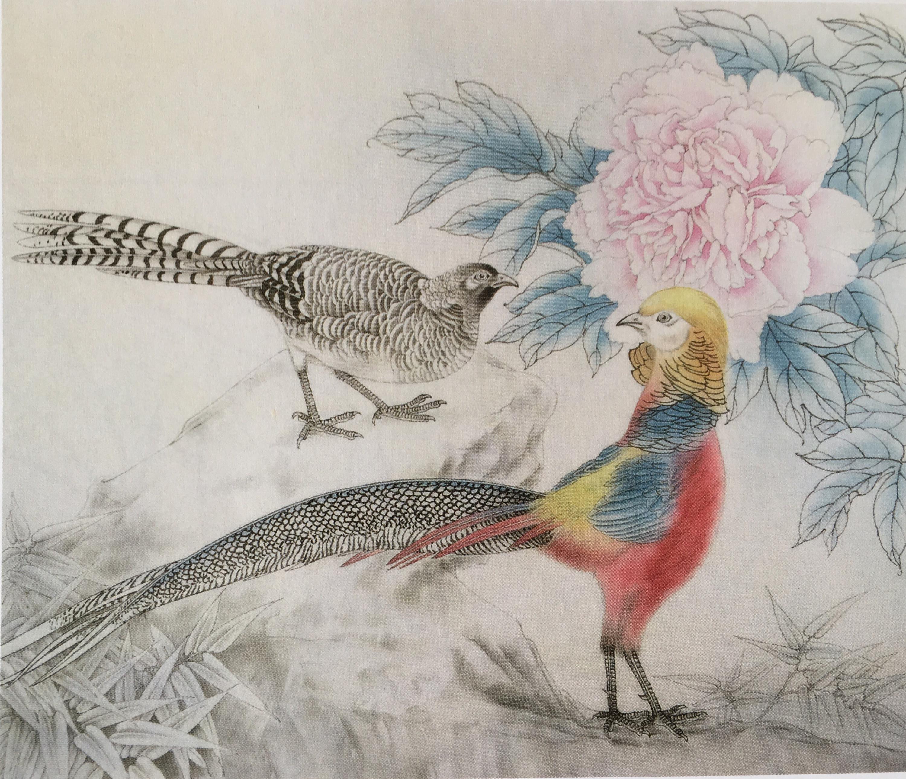 步骤六:整理是最后的完成部分,要注意整个画面的协调性。花头罩染淡大红,叶子罩染草绿。深入刻画锦鸡,丝毛,点睛,提画细节,锦鸡腹部用大红加墨丝毛,头部羽冠用钛白提高光,尾羽罩染花青,喙和爪子罩染藤黄。上背罩染钛白加酞青蓝,下背罩染花青墨。雌鸟暗处和头部用焦茶统染。竹叶部分统染花青墨,竹叶尖倒染胭脂。题字、铃印完成。