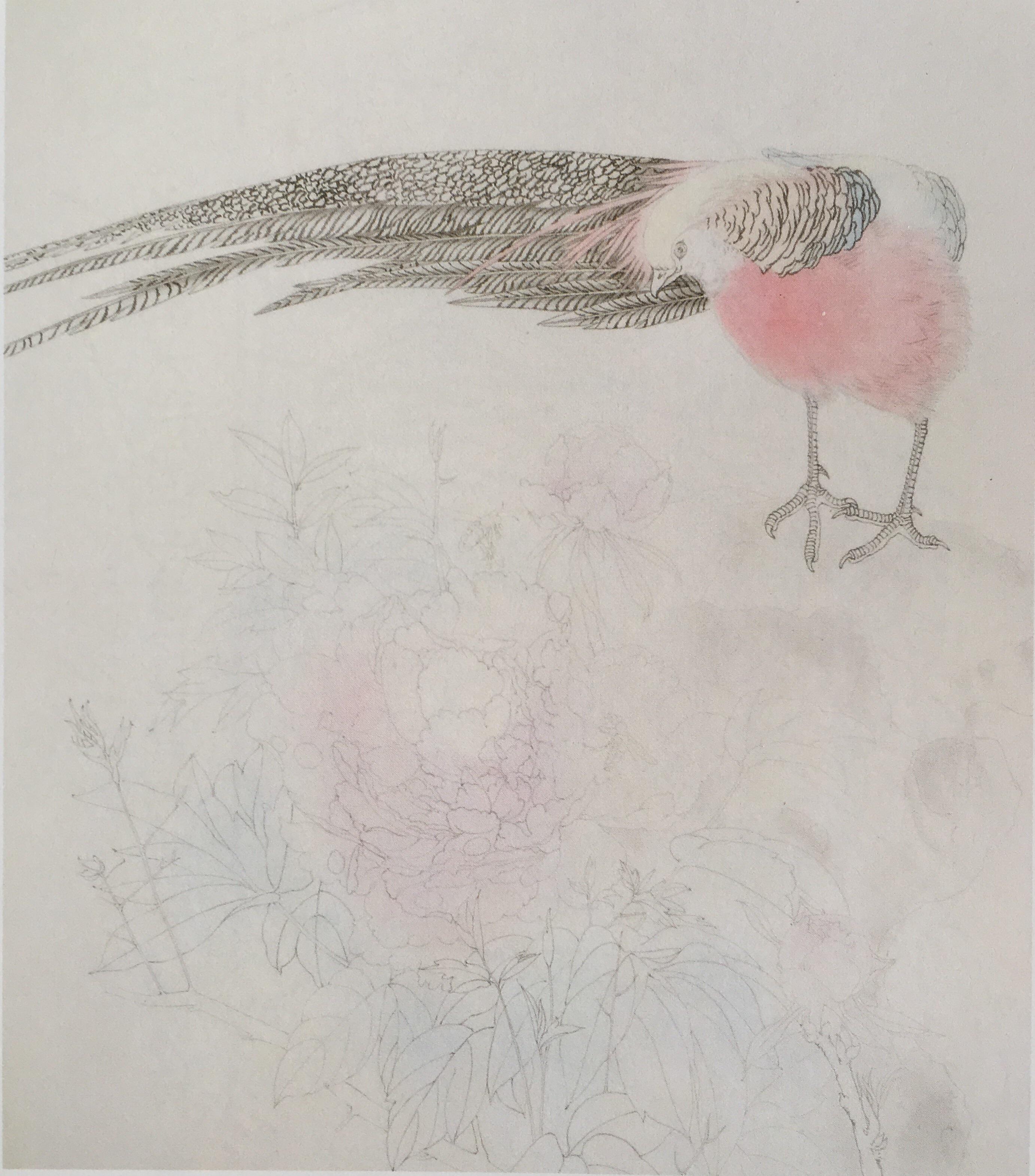 步骤二:先用淡颜色简单地把花和叶染开,花头先用钛白淡淡平涂,再用牡丹红晕染,叶子用酞青蓝大面积统染,不必太细。红腹锦鸡腹部用大红晕染,头部羽冠用藤黄,其他部分羽毛用朱磲和酞青蓝平涂,淡墨分染眼部、爪子和石头。