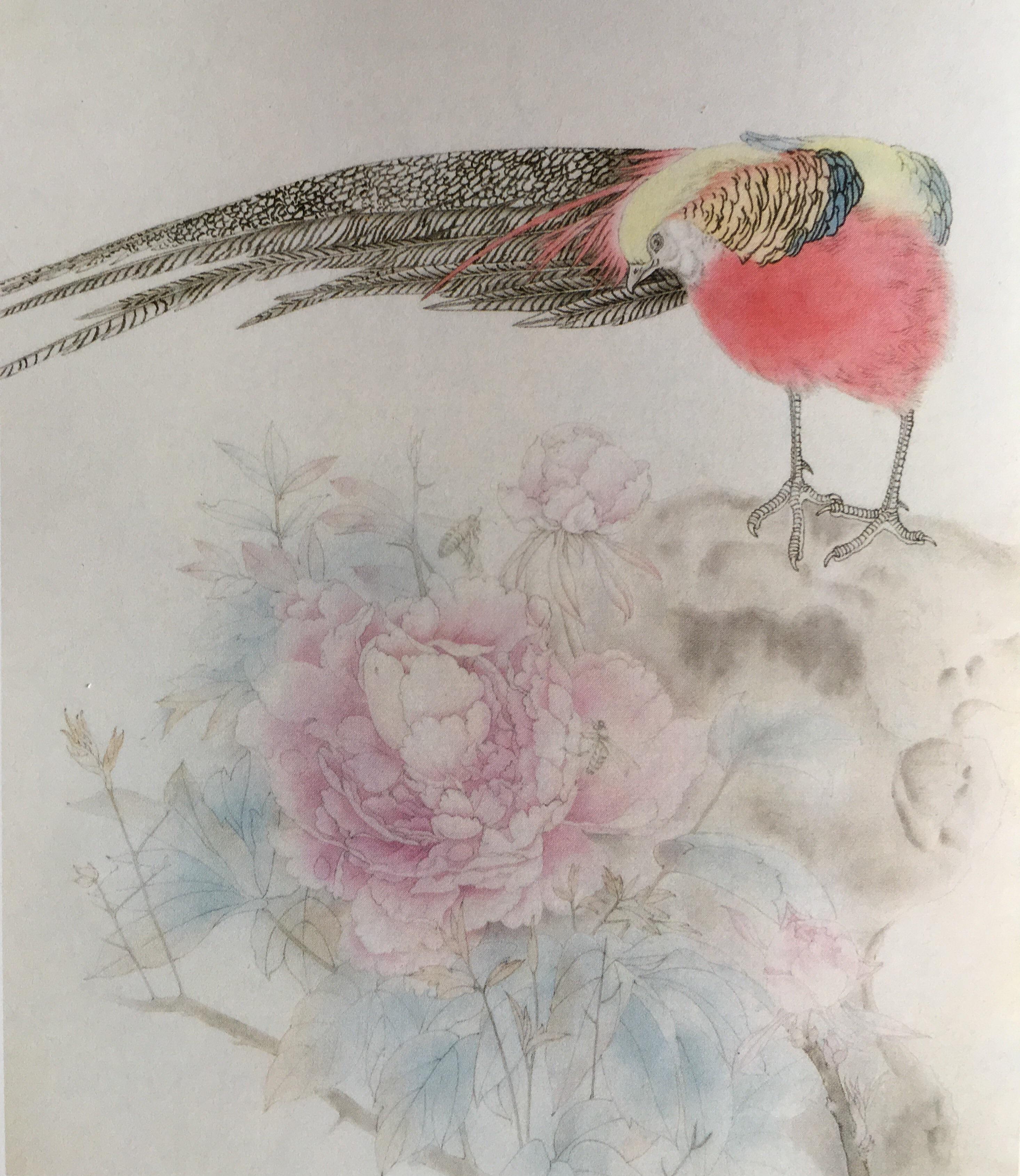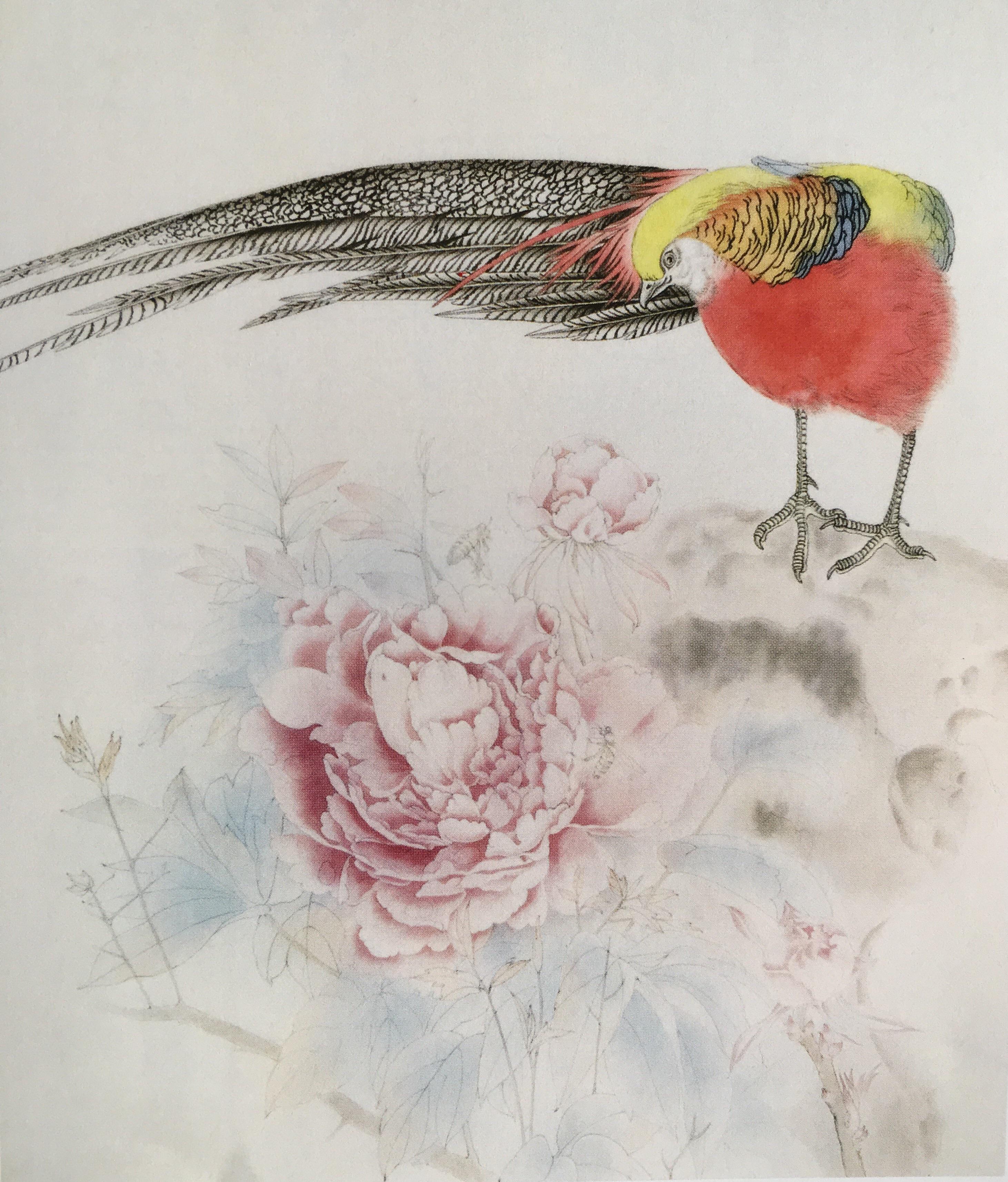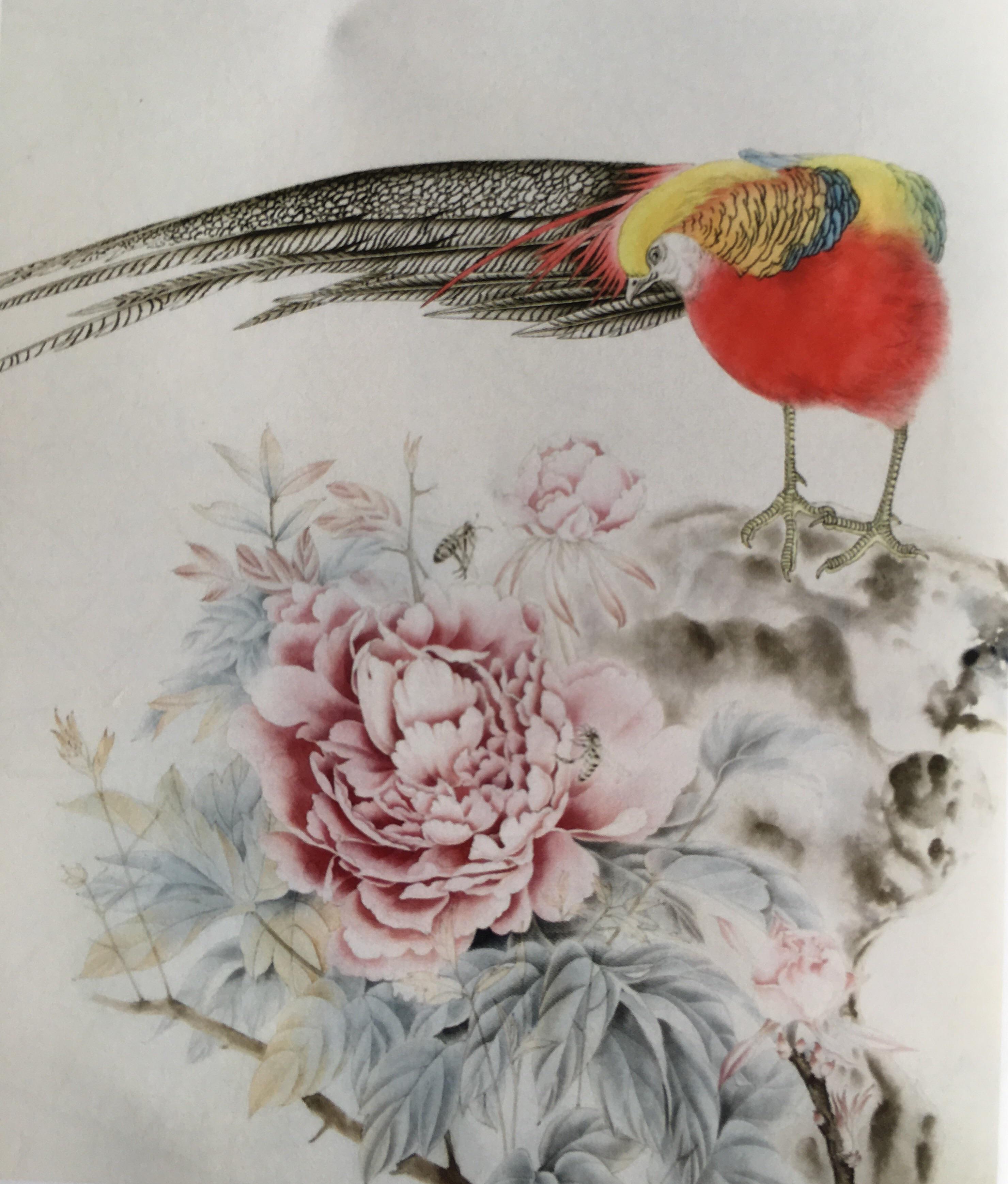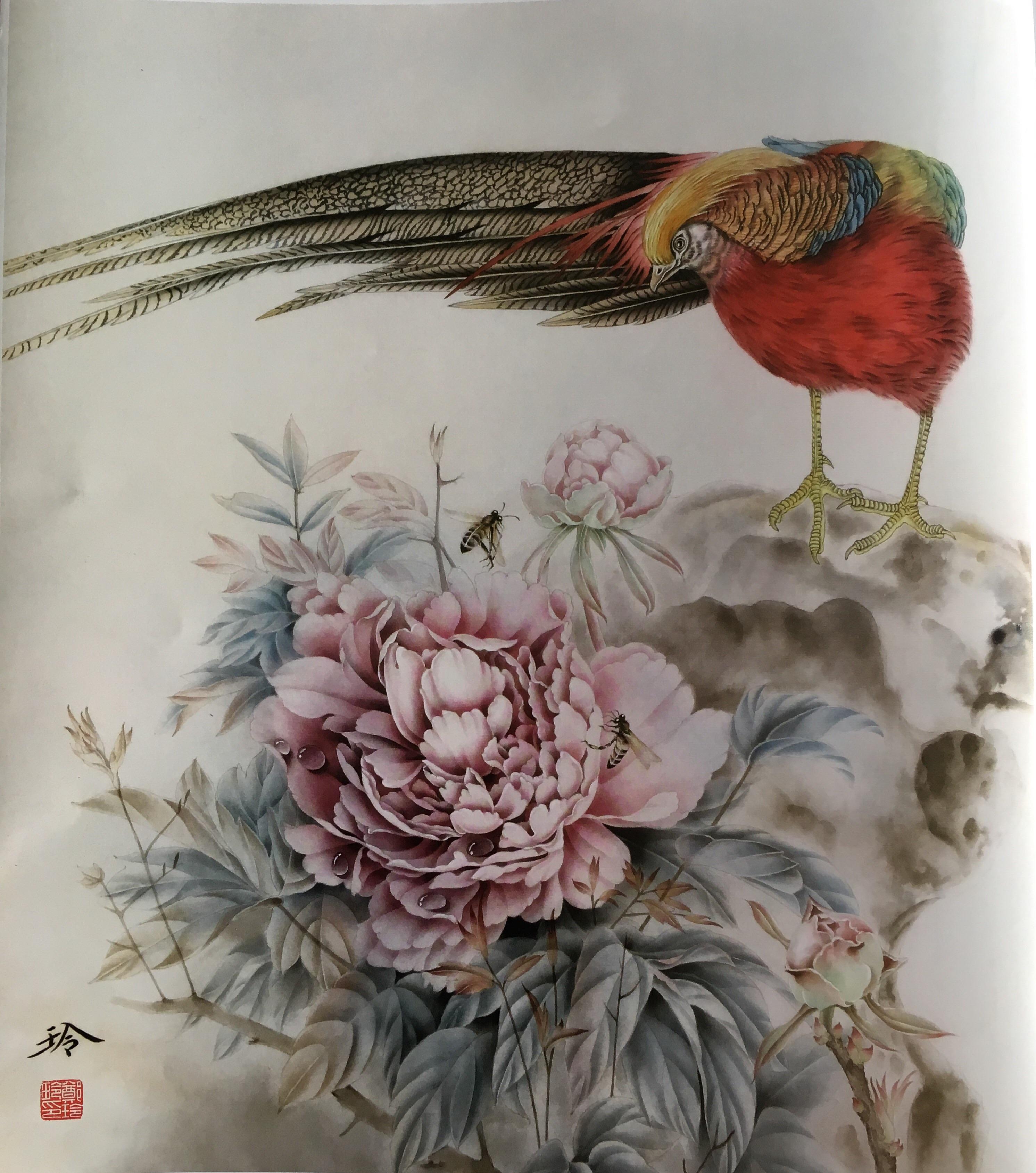 步骤六:最后进行整理,要注意整个画面的协调性。花头用钛白提亮高光,加深水珠的结构关系,提高光,花头前的嫩叶先用鹅黄平涂,再用腺脂倒染。深入刻画锦鸡,丝毛,点睛,提画细节,红腹锦鸡腹部用大红加墨丝毛,头要冠用饮白丝毛,尾羽用焦茶统染,隙和爪子翼染藤黄。题字、铃印完成。