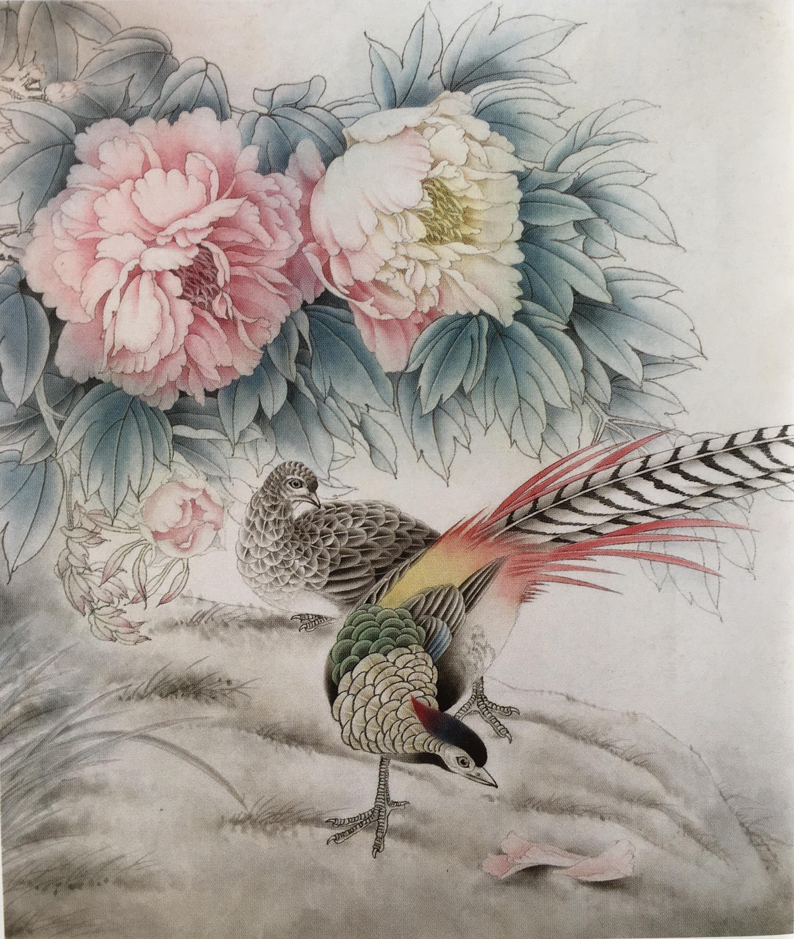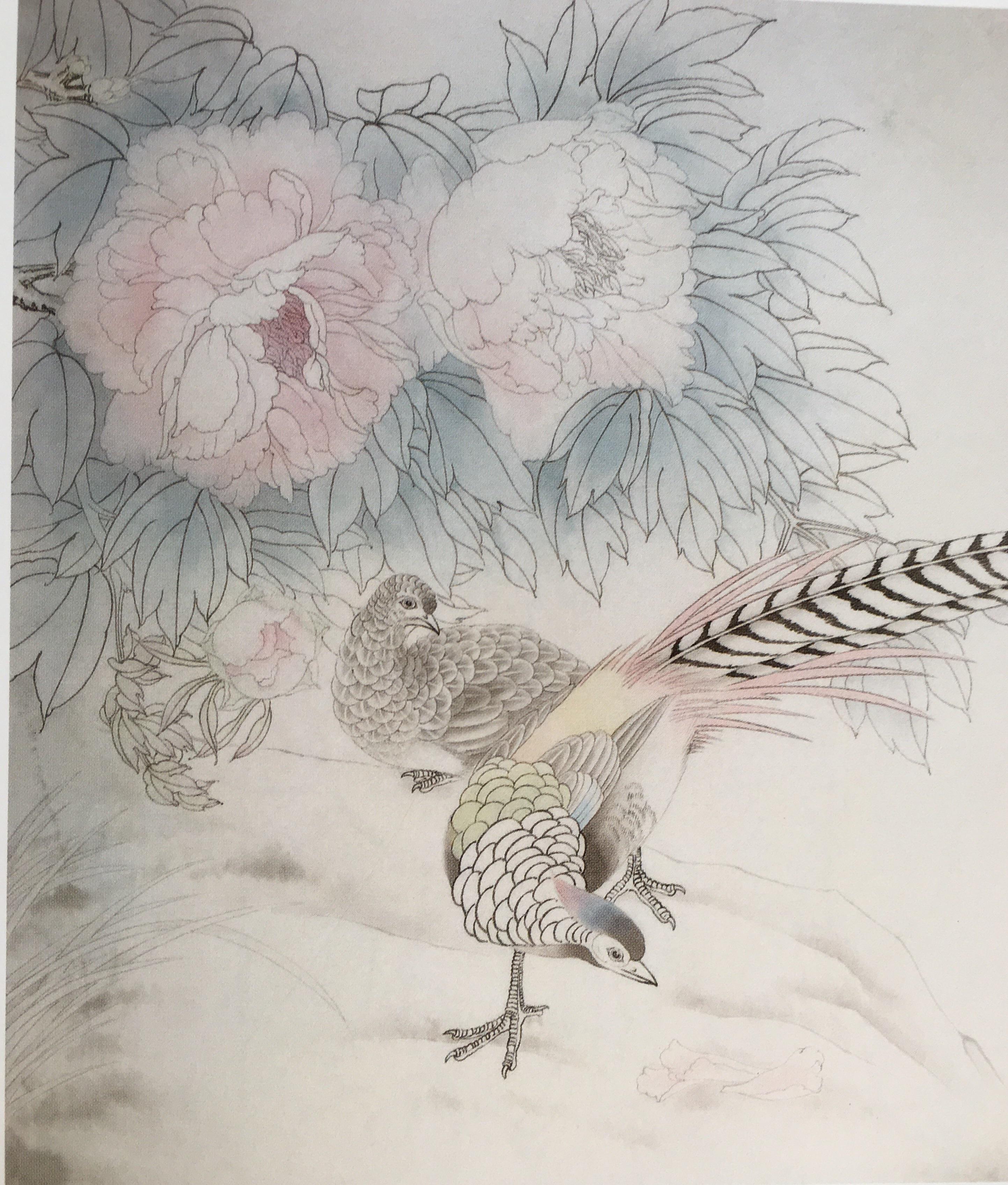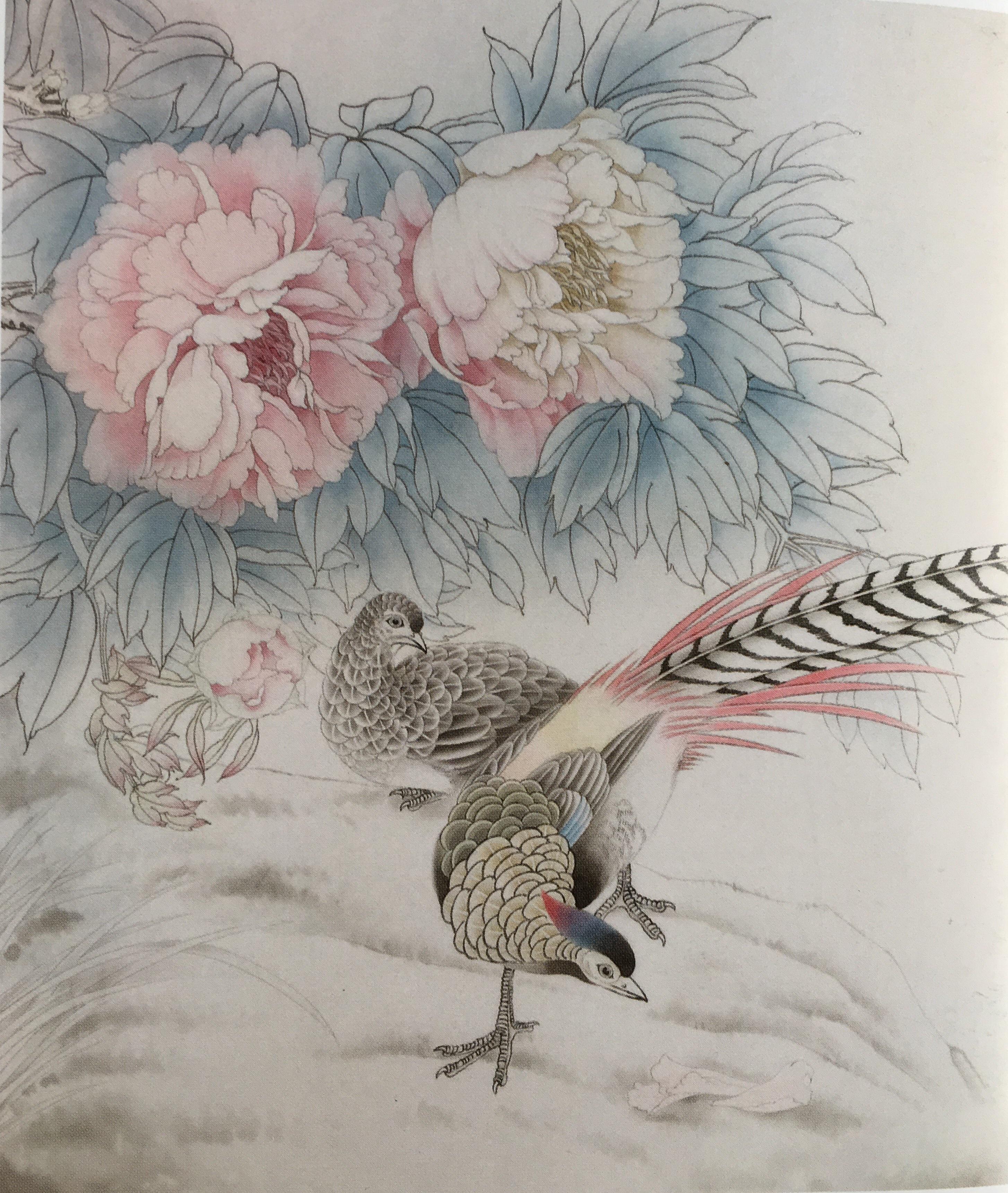 步骤六:从画面整体考虑,继续加深各处,刻画细节,注意整个画面的协调。白色花头用四绿进行边缘提染,花头附近的叶子用嫩绿进行倒染,整体再统染一下淡草绿。点花蕊的时候需要细心,先用藤黄分染,最后用钛白提高光。深入刻画锦鸡,丝毛、点睛,提画细节,锦鸡头部羽冠过渡要自然,尾羽用焦茶统染,钛白边缘提亮,喙和爪子罩染藤黄。画出雌鸟的羽毛斑纹,雌鸟暗处和头部用焦茶统染,腹部用钛白薄薄晕染。