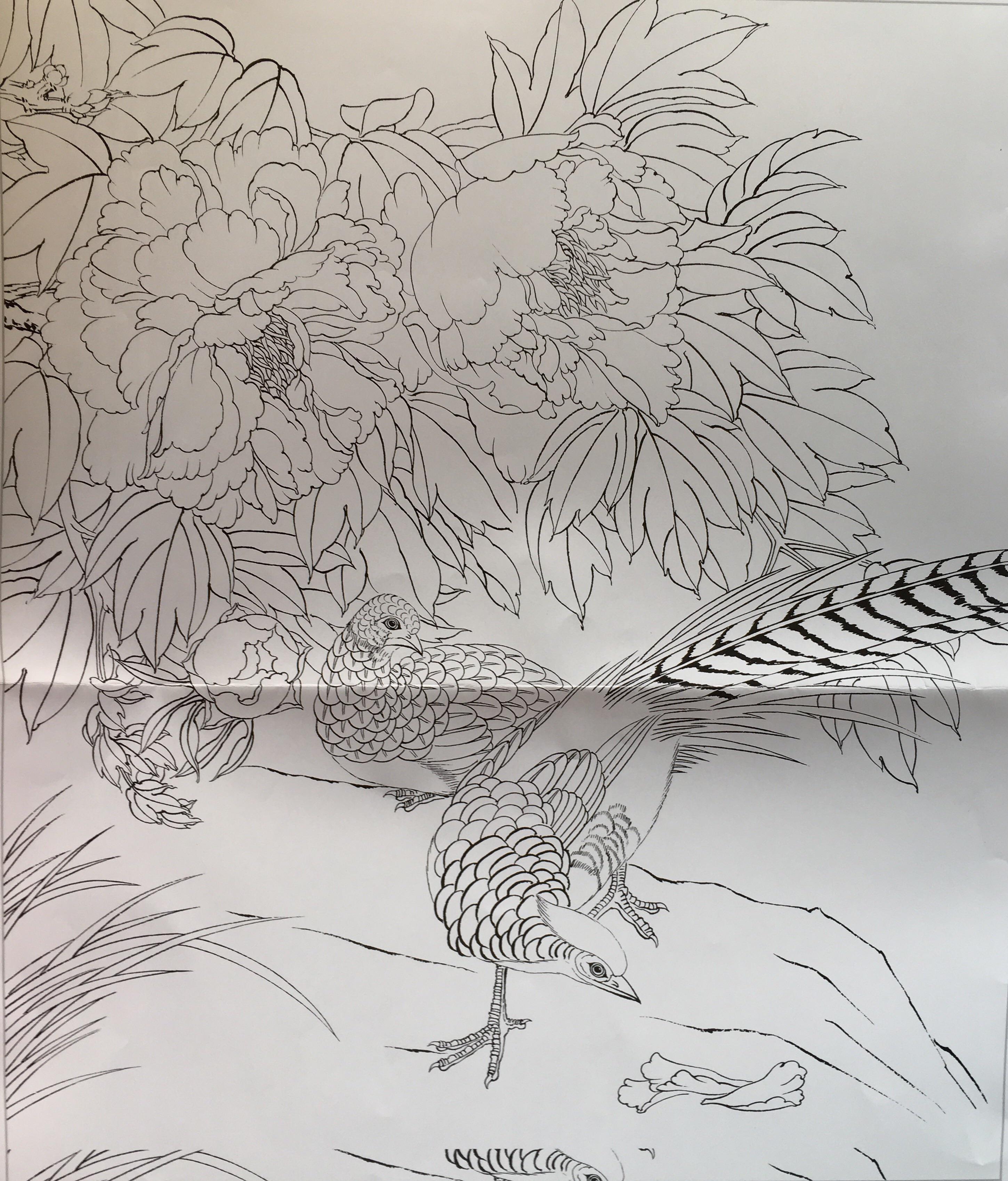步骤一:勾线。用重墨勾尾部的羽毛和羽冠,中墨勾咚、眼、爪子,淡墨勾颈、胸、腹、翅,稍淡墨勾花头和石头。