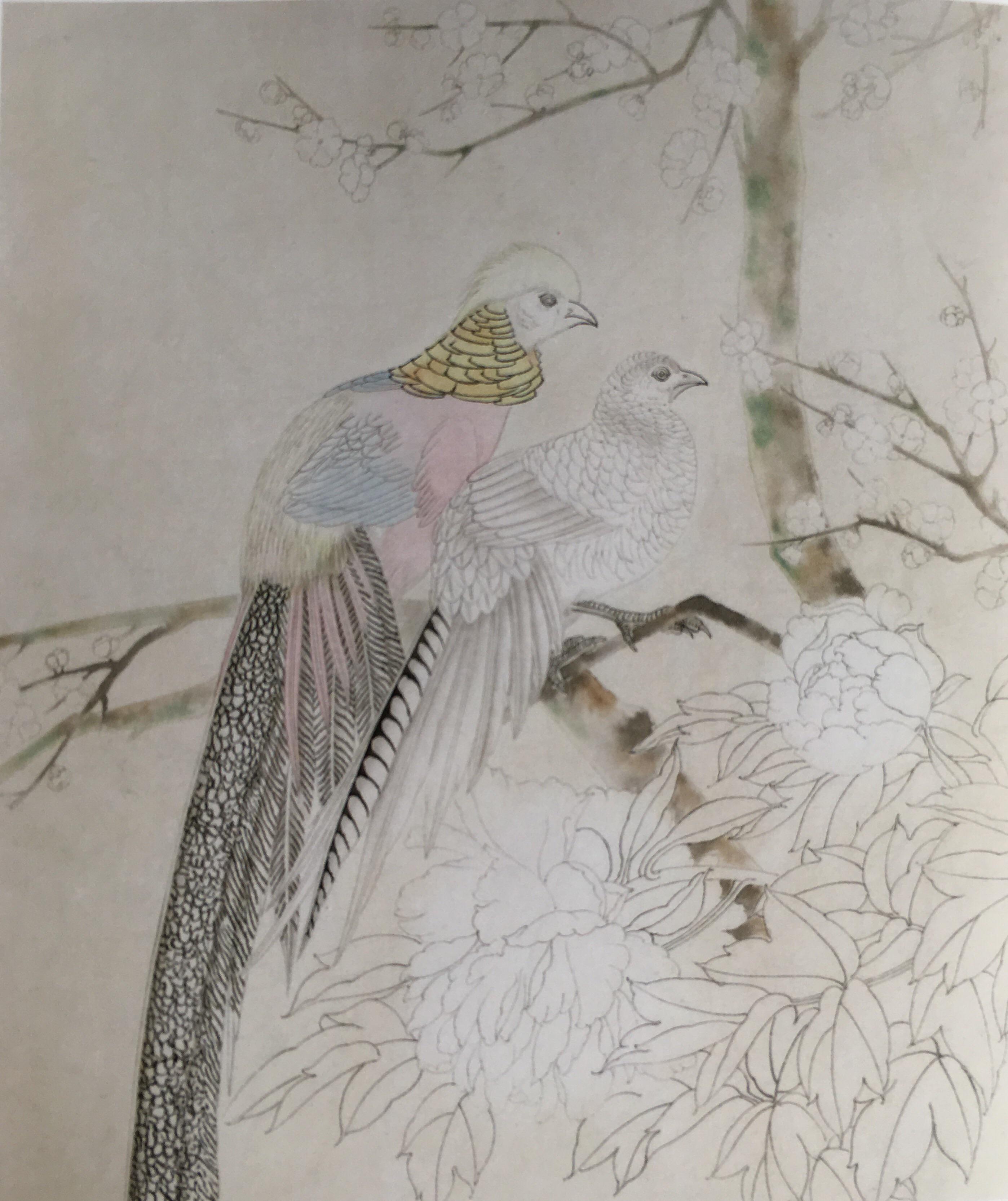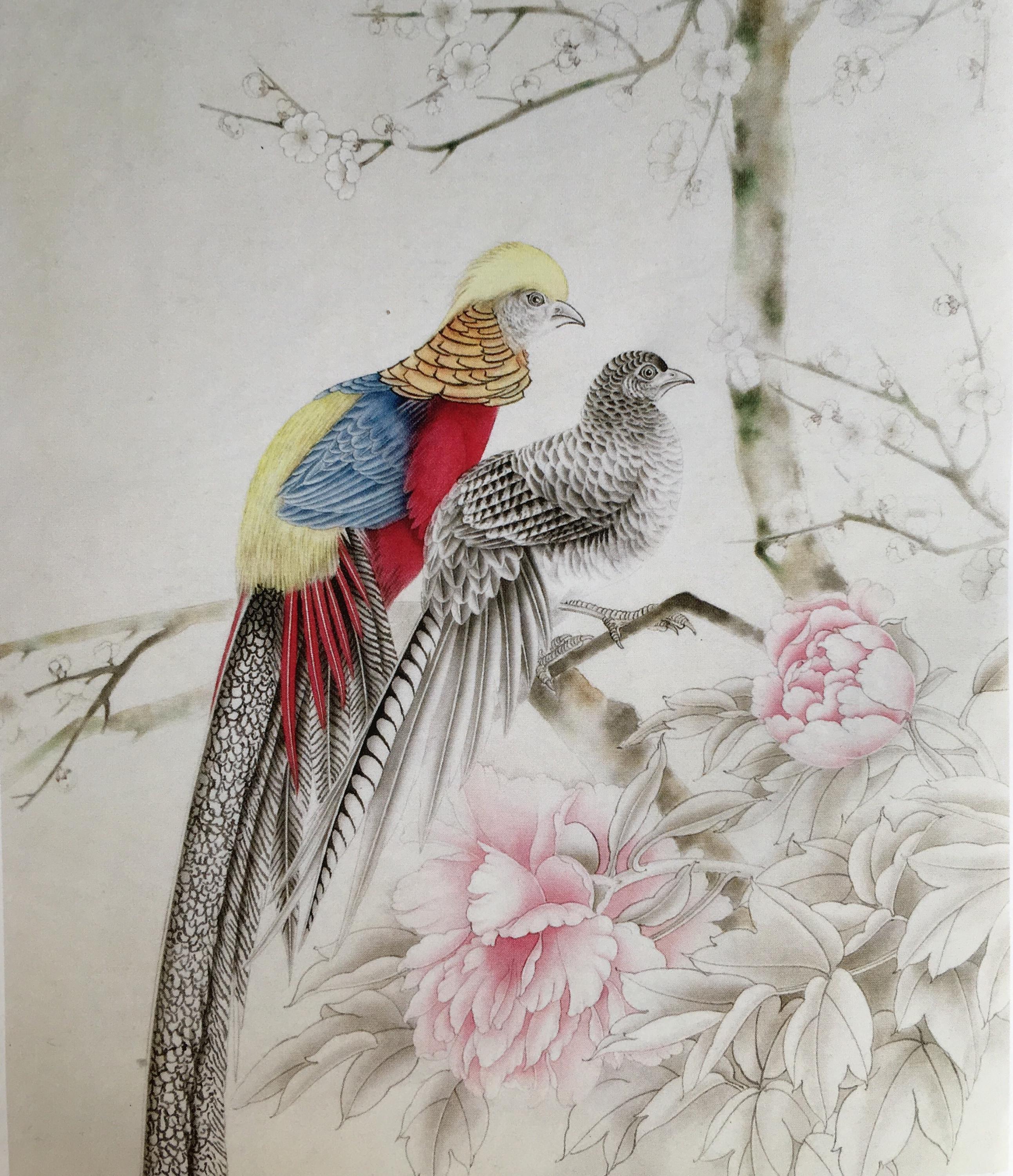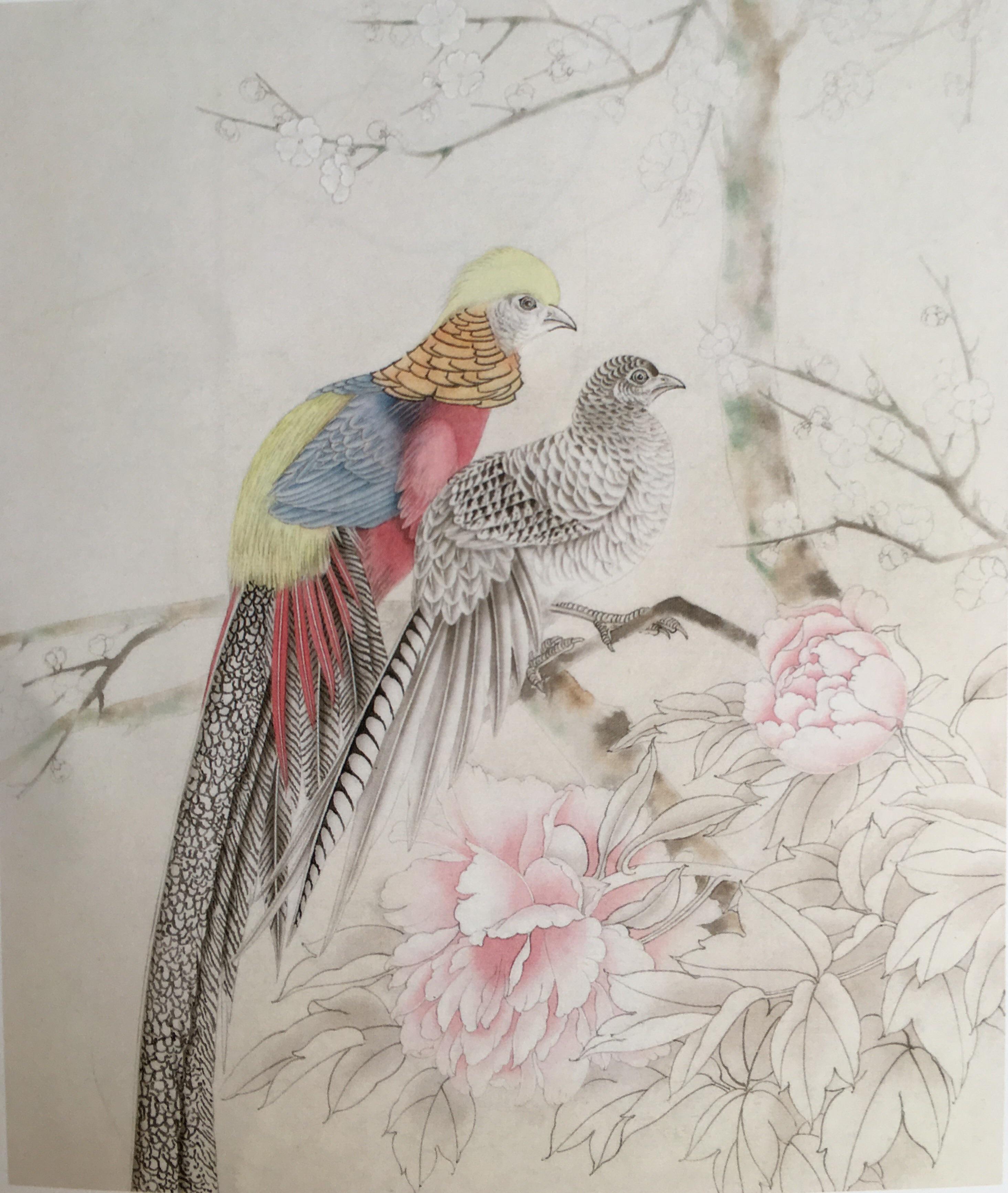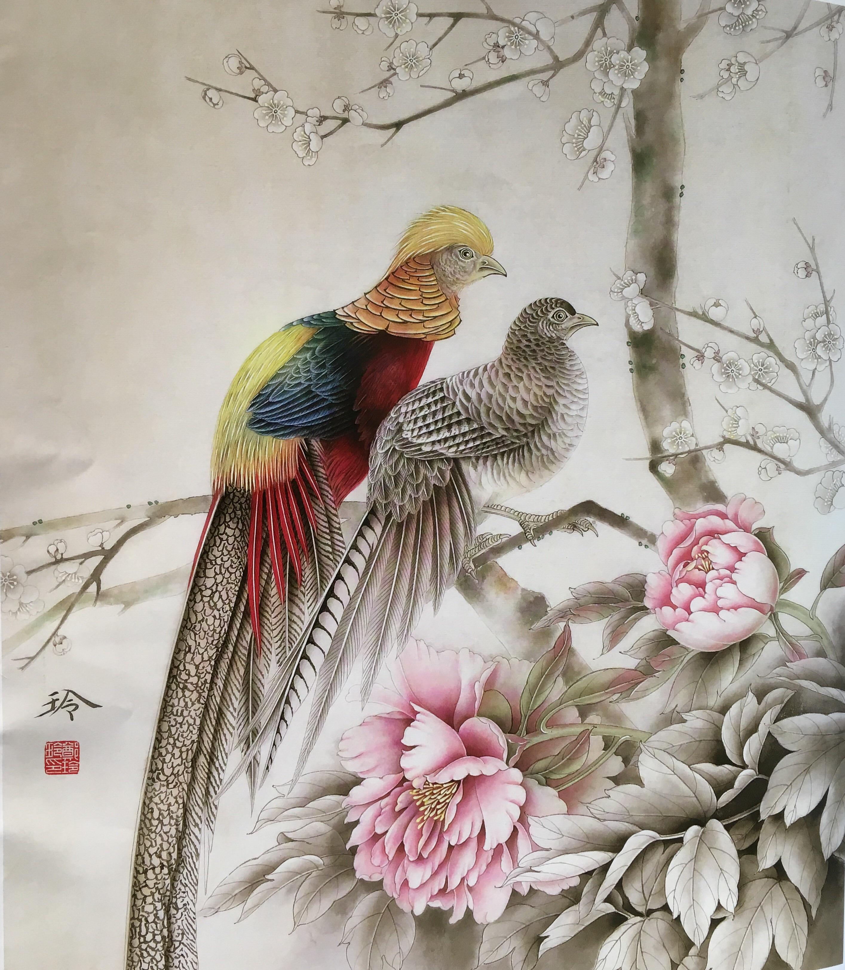 步骤六:精心刻画局部,调整深浅虚实关系,注意整个画面的协调性。花蕊用浓粉黄沥粉点,花头附近的嫩叶用草绿分染,胭脂进行倒染。深入刻画锦鸡,丝毛、点睛,提画细节,锦鸡背部注意使用环境色,过渡要自然,头部羽冠用钛白丝毛,尾羽用焦茶罩染。雌鸟暗处和头部用焦茶统染,尾羽用焦茶加大红罩染,略罩染藤黄。梅花用淡粉黄点蕊。题字、铃印完成。