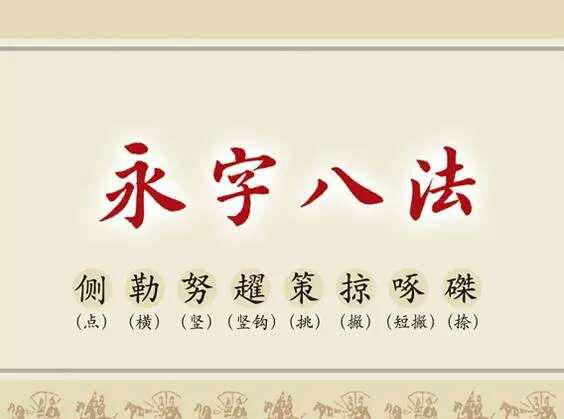 楷书用笔概括起来讲有八个基本点画,而永字正好概括了这一笔法,所以称为“永”字八法。它比较具体扼要地说明了楷书点画用笔和组织方法。因此,历来受到书法家们的重视,成为一种传统的教学方法。永字共有侧、勒、弩、趯、策、掠、啄、磔。
