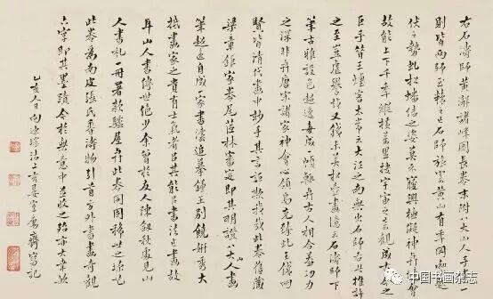 题跋:右石涛师黄澥诸峰图长卷,末附八大山人手书一则,皆两师至精之作。石师旅寄黄山有季,岗峦起伏之势、虬松蟠结之姿,莫不寝兴抚拟,神与境会。故能上下千季,纵横万里,搜宇宙之奇观,成古今之巨手。昔王烟客太常云:“大江之南无出石师右者。”推许之至,岂虚誉哉。又钱叔美《松壶画忆》云:“石涛师下笔古雅,设色超逸。每成一帧,辄与古人相合。盖功力之深非与唐宋诸家神会心领乌克臻此。”王钱两贤皆清代画中妙手,其言讵欺我哉。此卷旧藏梁章钜家,卷尾茝林审定即明证。八大山人画笔超逸,自成一家。书法追摹钟王,别饶妍秀。大抵画家之贵有士气者,以其能以书法作画,故耳山人书传世绝少。余曾于友人陈剑秋处见山人书札一册,署款驴屋,与此卷同,固稀世之珍藏。此卷为南皮张氏香涛物,引首“方外书画奇观”六字即其墨迹。今于无意中并收之,殆亦大幸欤。乙亥人日向迪琮沽上玄晏室寓斋写记。