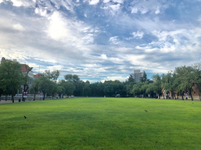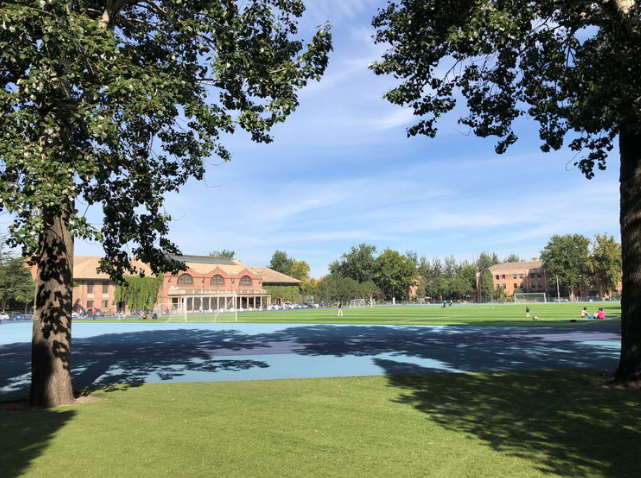 己舖上塑胶,远处的建筑左边是“西体”,右边是明斋。