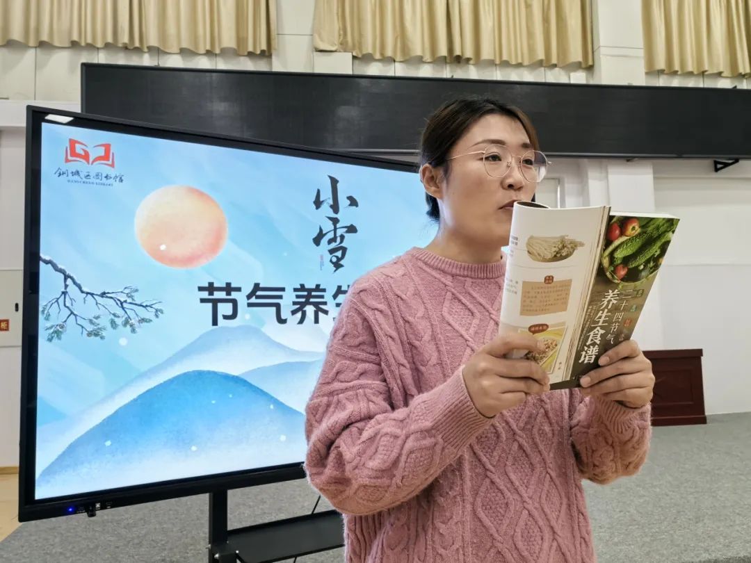 小雪至,寒冬始 11月22日 钢城区图书馆举办 小雪节气养生讲座 养生课堂 馆内工作人员简单介绍了一下小雪知识,小雪是二十四节气中的第二十个节气,进入冬季之后,太阳逐渐南移,大地的光照时间越来越少,气温也随之越来越低。随后利用书籍为读者们介绍如何利用食谱度过一个健康幸福的冬天,例如滋补的羊肉汤,润肺的雪梨羹,对大家都很有帮助。 此次活动让大家掌握了实用的冬季养生知识,度过一个温暖健康的冬天。