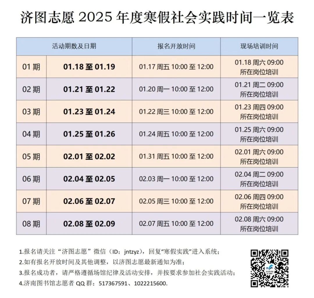 这个寒假,别再让时光悄然流逝,济图志愿诚挚呼唤你的名字!济南市图书馆联合济南市青年志愿者协会,共同开展“济图志愿2025寒假社会实践”活动。在这里,你将协助图书馆日常运营工作,引导读者借阅书籍、整理书架,参与各类阅读推广活动等,亲身感受文化传播的力量。 本次寒假社会实践定于2025年1月18日至2025年2月9日,分8期进行,现面向社会公开招募志愿者。 年满14周岁及以上在校学生(2011-01-01之前出生,以身份证信息为准); 品德良好、纪律性强,态度积极端正,乐于奉献; 热爱图书馆,热爱公益事业,自愿参加志愿服务活动; 自觉遵守各项规章制度,服从济图志愿工作安排; 无不良信用记录,确保志愿者身体健康,无不良状况。 协助读者操作自助设备,完成文献借还、读者证办理、入馆登记等; 解答读者咨询、维护场馆秩序,参与场馆卫生清扫; 完成文献上架、排架、整理等图书馆日常管理工作。 本次社会实践共有55个服务地点 正式报名时,请选择有意参与场馆即可 本次社会实践 每期2天、每天8.5小时 温馨提示: 午间30分钟就餐时间,听从现场工作人员安排; 活动日期如有变动,以最新通知为准。 书 香 泉 城 · 爱 阅 之 都