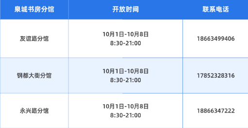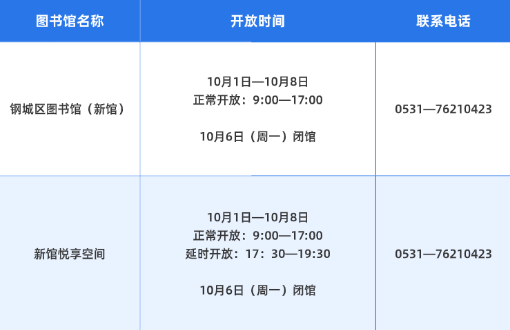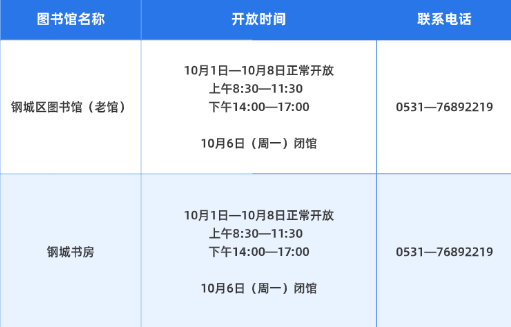 通知 | 钢城区图书馆及各书房国庆假期开放时间
